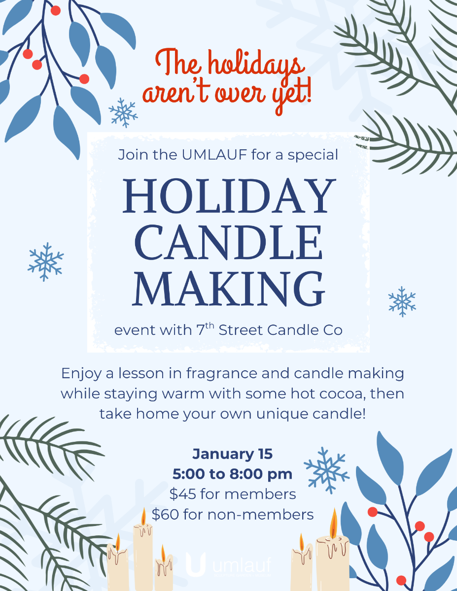 The holidays aren't over yet! Join us at the UMLAUF to develop and create your own signature candle scent. 7th Street Candle Co will be presenting a lesson where you will learn the art of fragrance and create a unique, non-toxic candle that you will take home to enjoy! While you wait for your candle to cool, enjoy a hot cocoa bar and some light bites, and the company of fellow UMLAUF members.