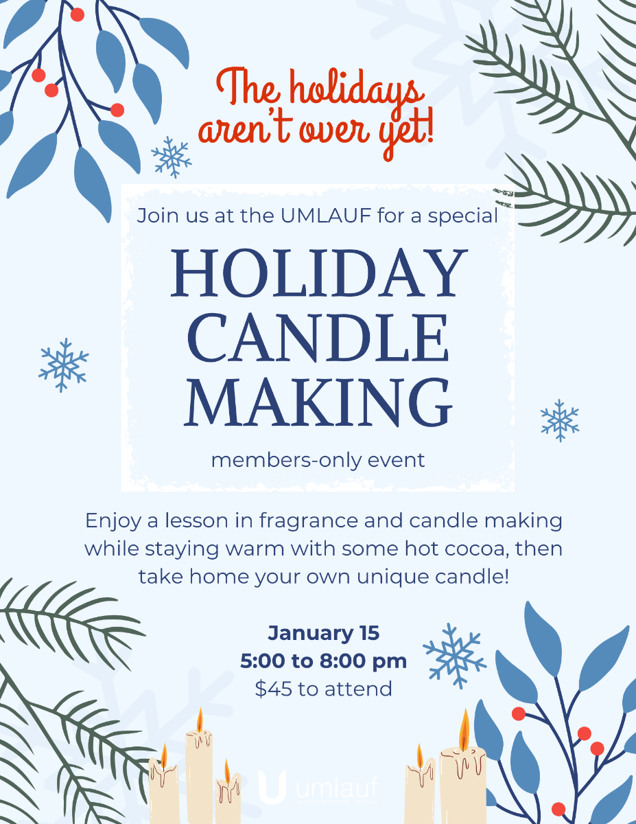 The holidays aren't over yet! Join us at the UMLAUF to develop and create your own signature candle scent. 7th Street Candle Co will be presenting a lesson where you will learn the art of fragrance and create a unique, non-toxic candle that you will take home to enjoy! While you wait for your candle to cool, wander through the garden, enjoy a hot cocoa bar and some light bites, and the company of fellow UMLAUF members.